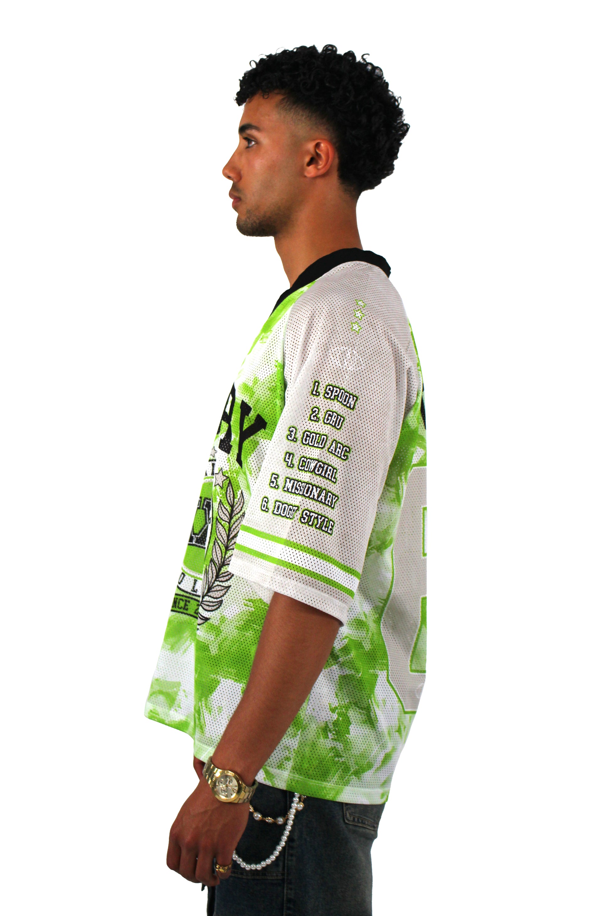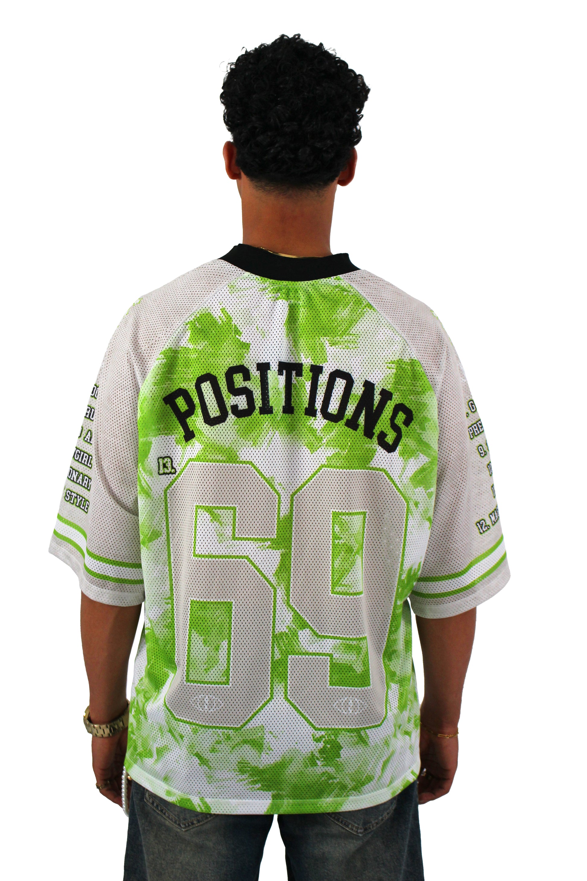 - "POSITIONS 69" oversized screen print on the reverse.