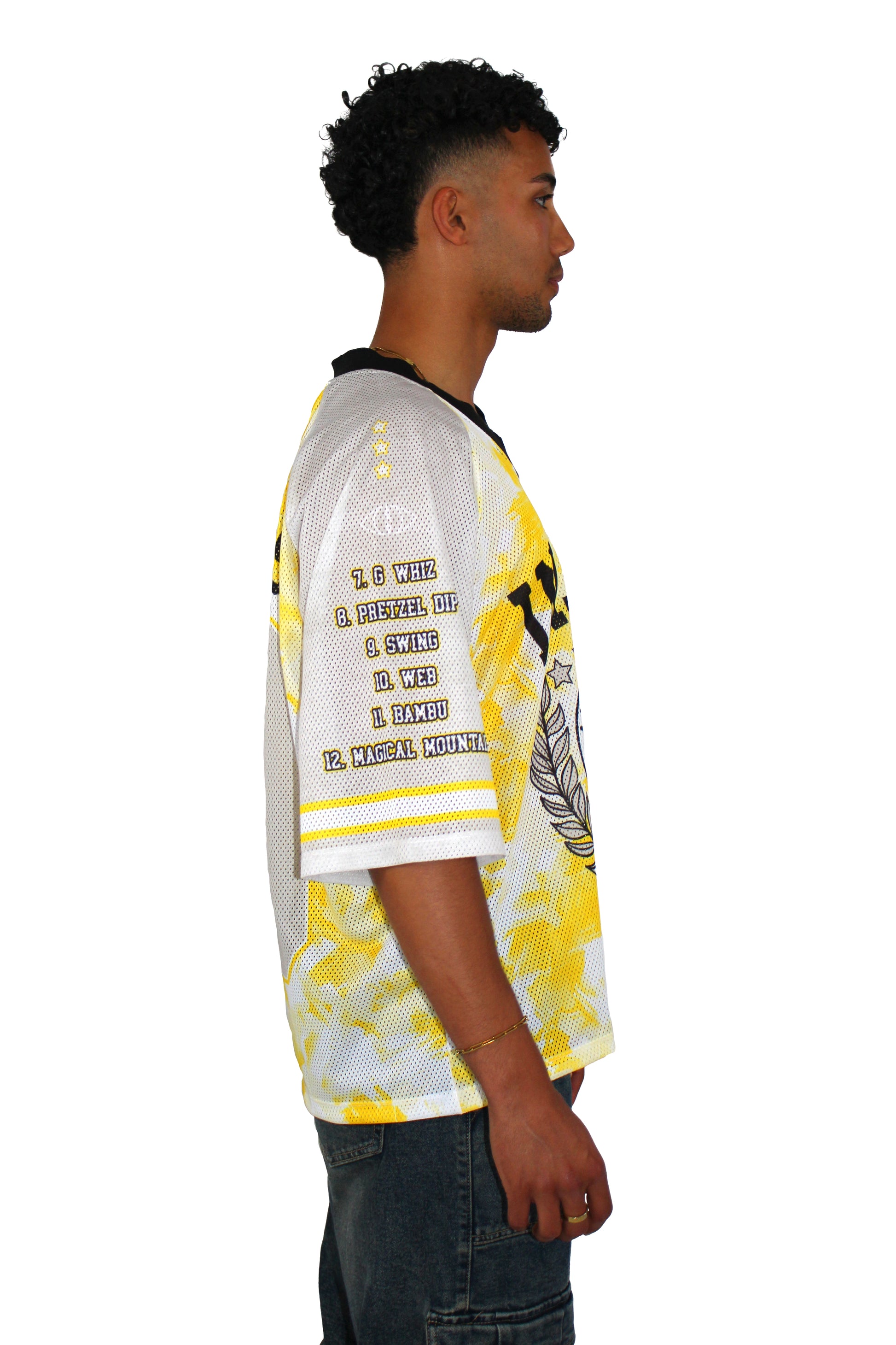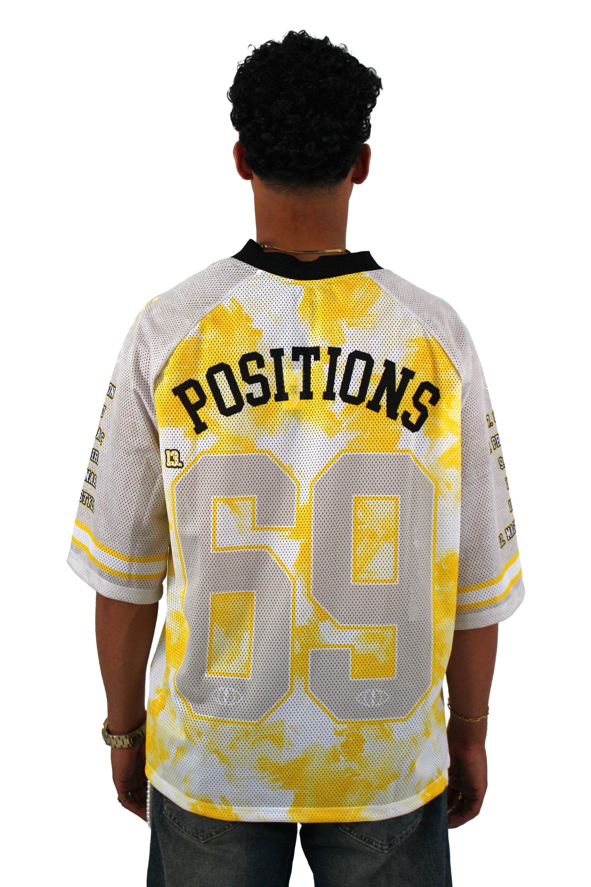 - "POSITIONS 69" oversized screen print on the reverse.